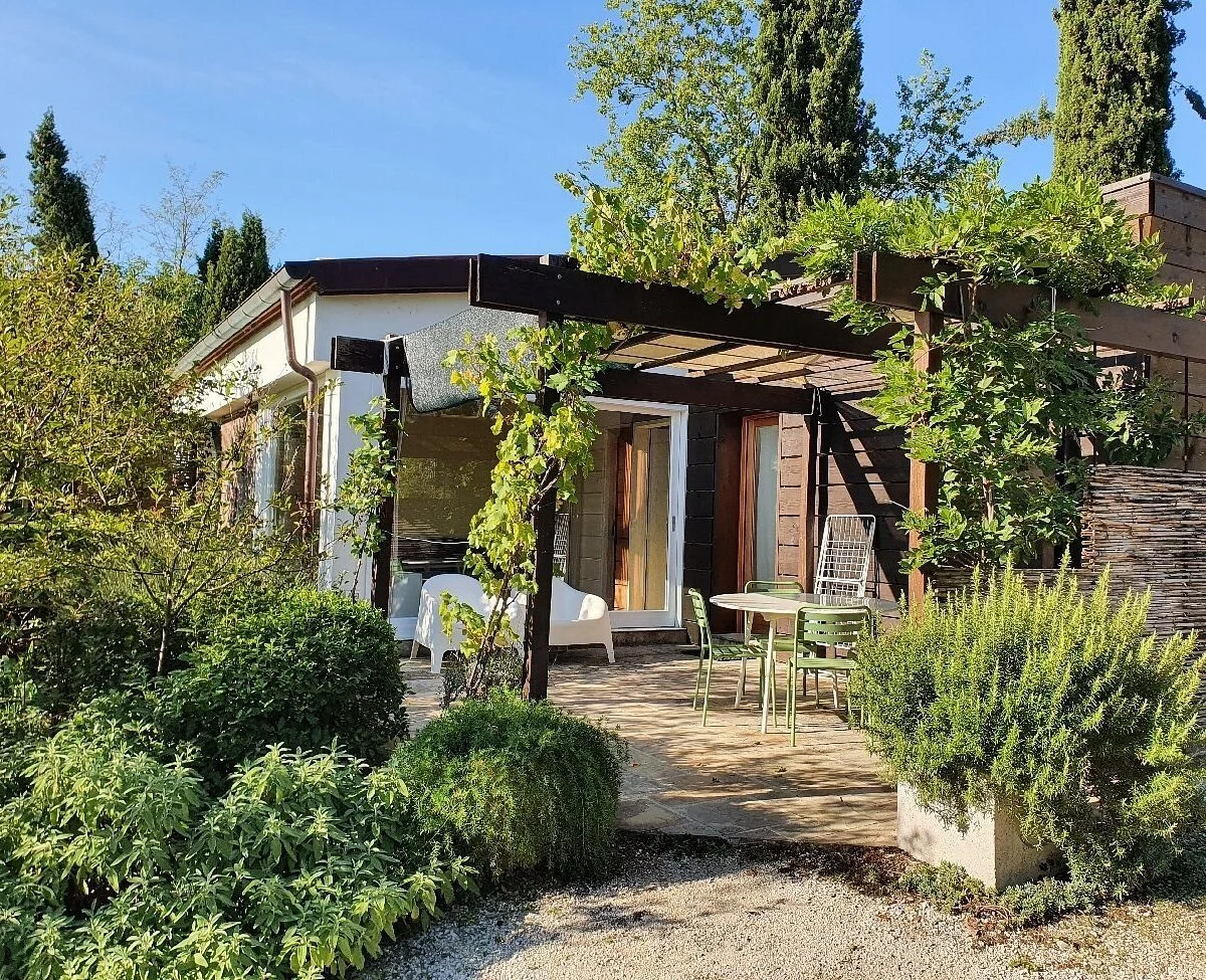 Er zijn twee slaapkamers: één met een tweepersoonsbed, en één met twee eenpersoonsbedden. Extra slaapgelegenheid kan gecreëerd worden op de slaapzetel. Er is een badkamer met toilet en een aparte leefruimte met ingerichte keuken. Kookgerei, koelkast en vaatwasser maken je verblijf écht tot je thuis onder de zon.